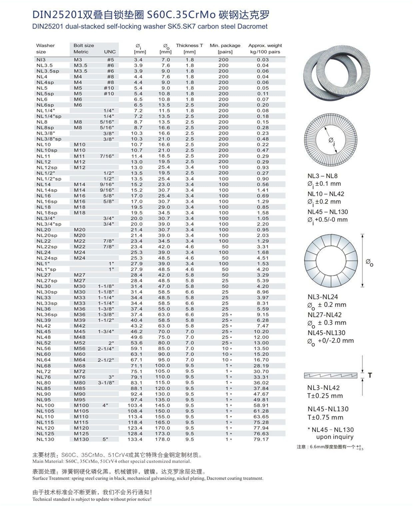 制造工艺:DIN25201标准垫圈全部使用S60C/SK5及特殊合金钢材质、经过全硬化处理HRC45-52、硬度等级14.9级!