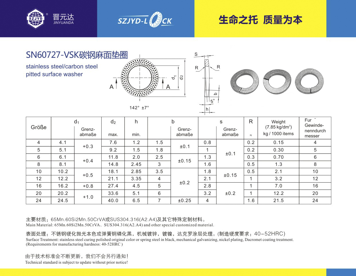 SN60727-VSK垫圈由西门子轨道交通公司设计、基本张力摩擦构造原理的紧固防松方式。麻面花纹与螺栓锁紧面接触增加了锁紧效果!