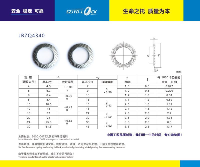 JBZQ4340防松垫圈、执行中国机械标准、通常配合8.8级以上螺栓使用!技术成熟、性能稳定、性价比高正在被越来越多的工业装备领域大量使用!