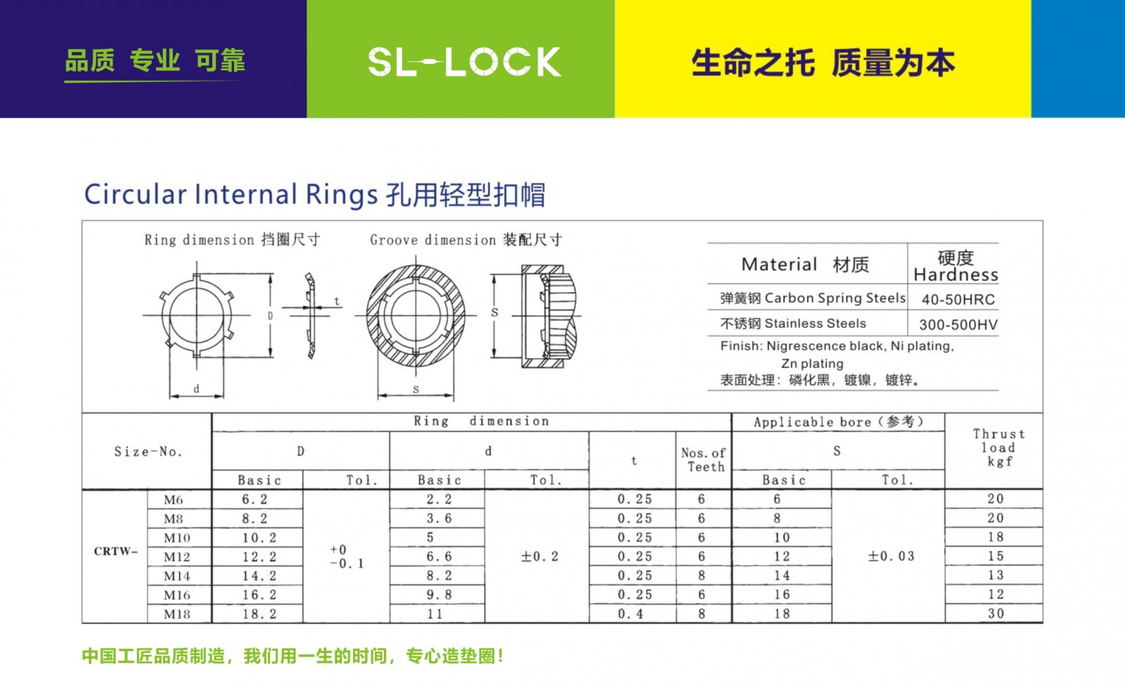 名称:轻型孔用止动垫圈 执行标准:CRTW 型号:M6-M18 材质:65MN/C67S 表面处理:磷化黑色